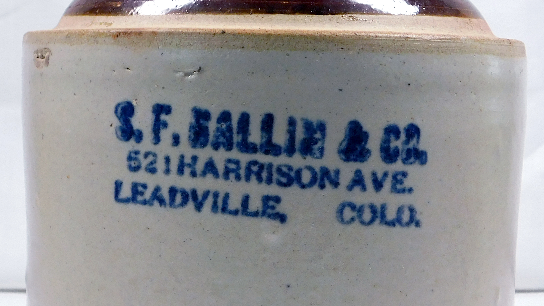 Half gallon clay whiskey jug that is overall beige color with brown glaze on the top quarter. Printing in blue on the main body shows ?S. F. Ballin & Co. 521 Harrison Ave. Leadville, Colo.? The original loop handle is completely missing along with about a third of the spout where the handle was attached.