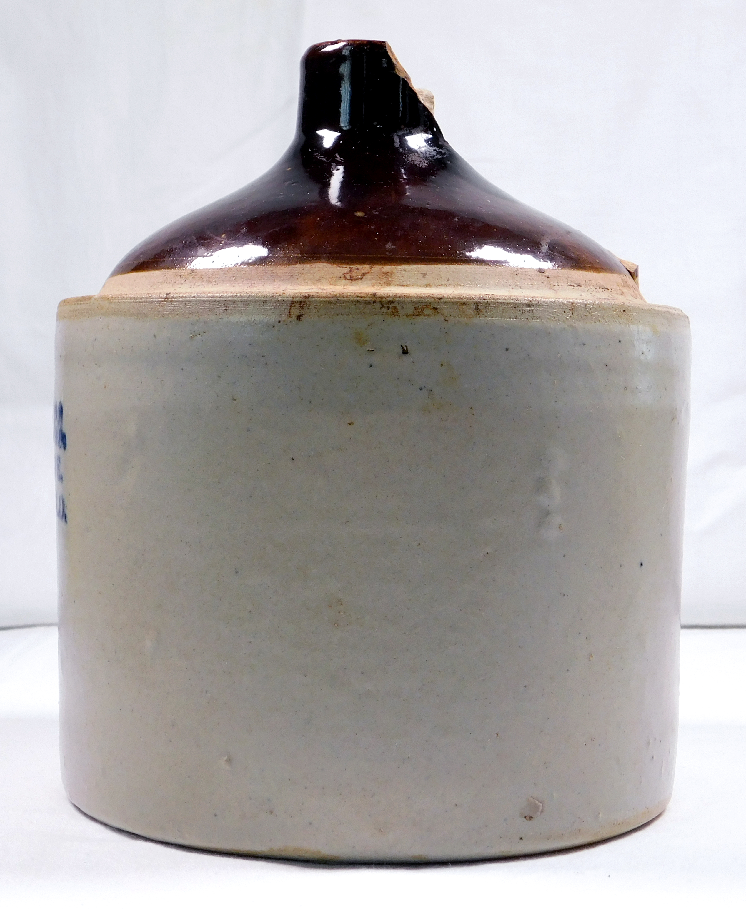 Half gallon clay whiskey jug that is overall beige color with brown glaze on the top quarter. Printing in blue on the main body shows ?S. F. Ballin & Co. 521 Harrison Ave. Leadville, Colo.? The original loop handle is completely missing along with about a third of the spout where the handle was attached.